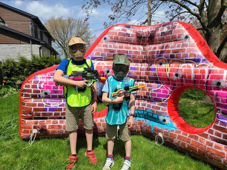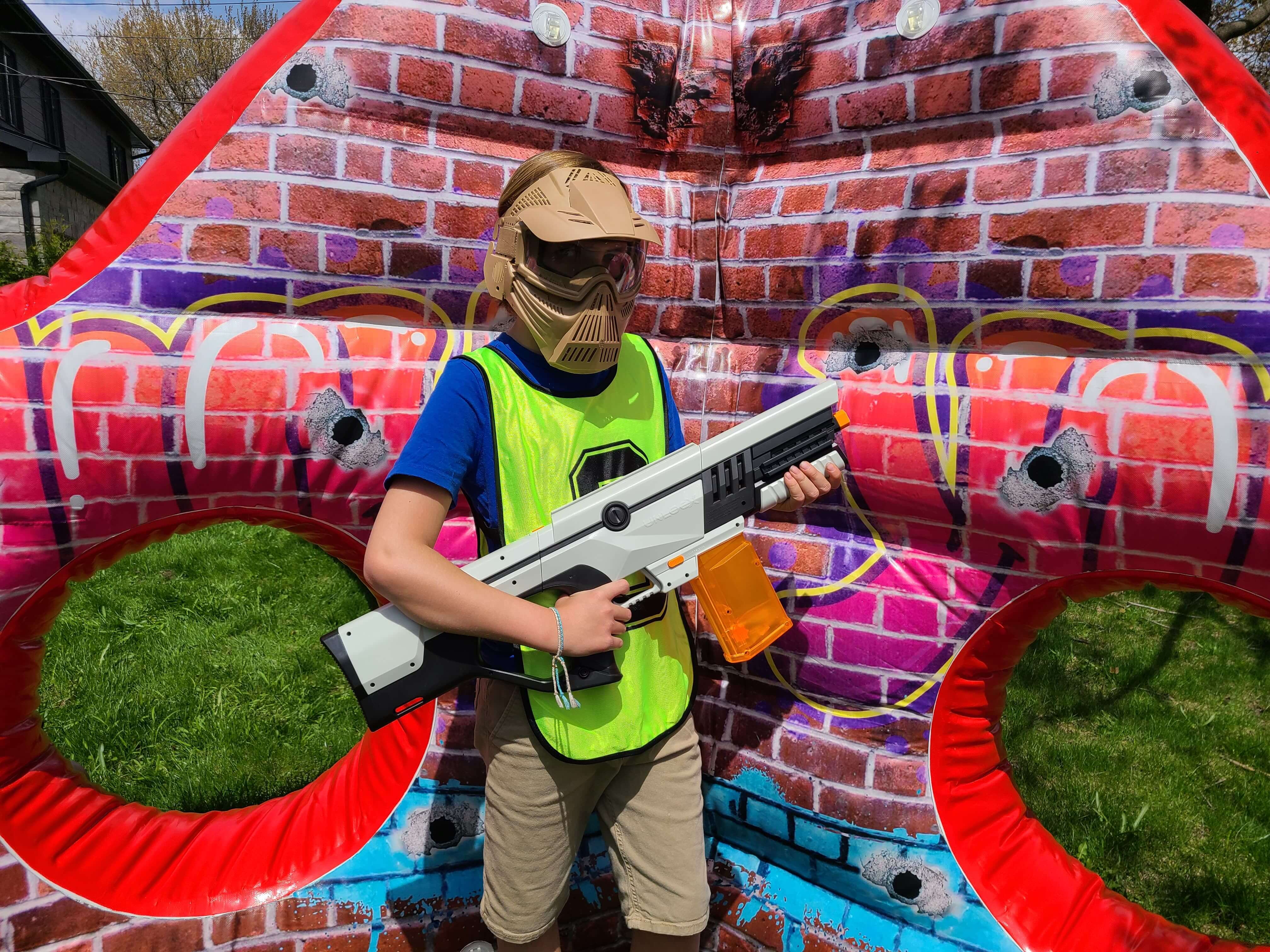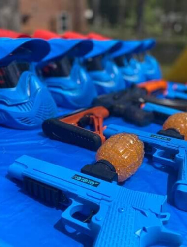 Nous amenons la fête des jelly-balls chez vous. Nous fournissons huit blasters et des masques de sécurité, ainsi que 15 000 balles en gelée et des tranchées gonflables. Vous avez la possibilité de venir chercher le matériel vous-même.
