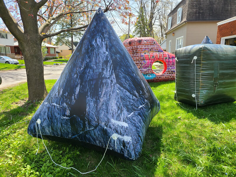 Tout dépend du nombre de joueurs qui jouent en même temps. L'aire de jeu minimale recommandée pour une partie à 8 joueurs est de 15 mètres sur 10 mètres. Il est IMPORTANT que les spectateurs ne soient pas présents pendant le jeu ou qu'ils aient au moins des lunettes de protection au cas où une balle en gelée les atteindrait pendant que les participants jouent dans une zone ouverte.
